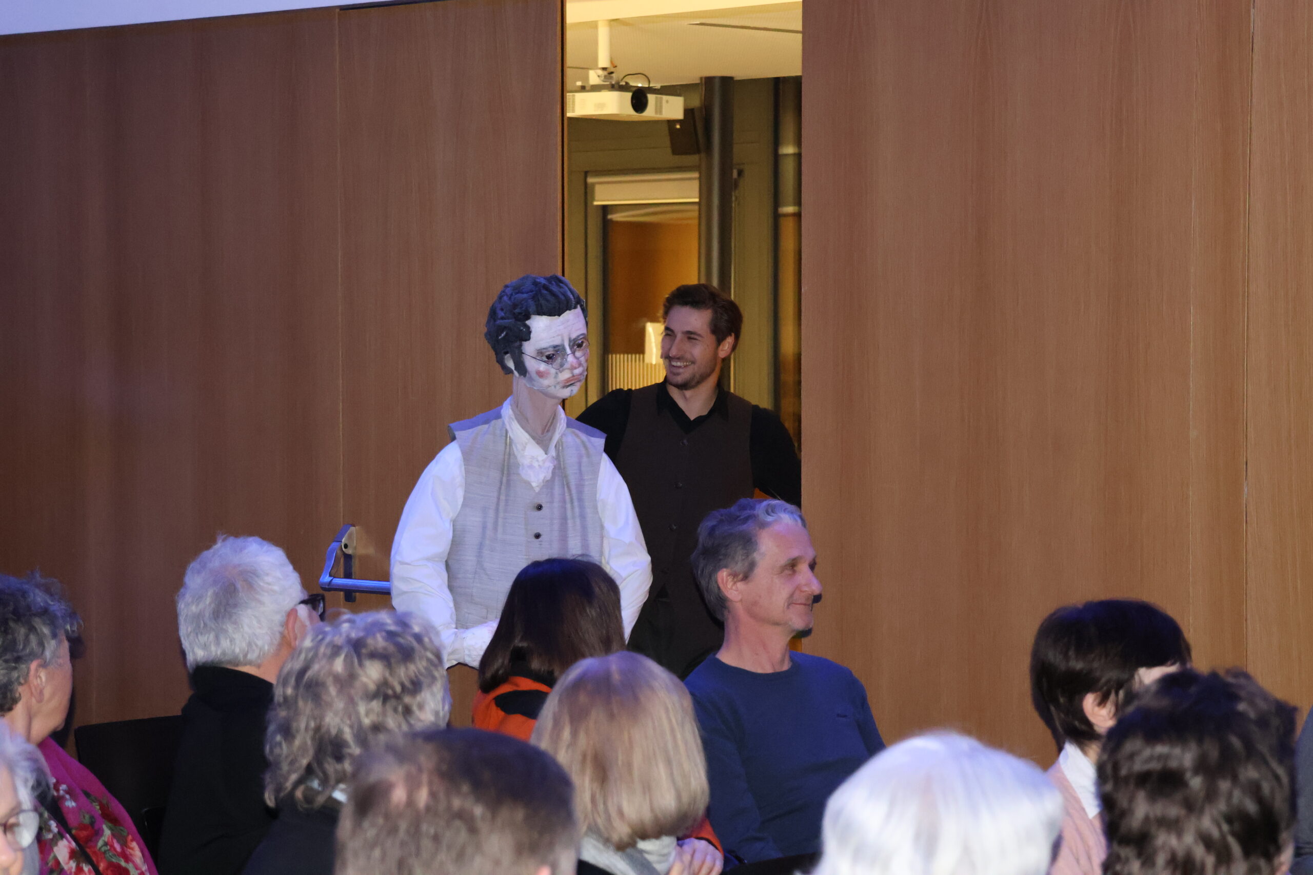 Vor genau 200 Jahren verfällt der berühmte Wiener Komponist Franz Schubert unter dem Eindruck der ,Große Fuge Opus 133″ seines großen Vorbilds Ludwig van Beethoven in eine tiefe, dreimonatige Schaffenskrise. ,,Geh, Franzl!“ ermuntert ihn sein Freund Moritz von Schwind, gespielt von Angelo Konzett, fortlaufend zur Wiederaufnahme seiner bis dahin unaufhörlichen kreativen Tätigkeit. Mit größtem Anspruch an sich selbst zweifelt die lebensgroße Schubert-Puppe, ebenfalls von Konzett geführt und gesprochen, an sich selbst. Bis die Erkenntnis kommt, dass Schubert Schubert sein darf und nicht wie sein ldol Beethoven sein muss. Daraufhin schreibt der Komponist im Sommer 1826 in einem fast unmenschlich anmutenden Kreativitätsausbruch in nur zehn Tagen das Streichquartettin G-Dur, D 8S7″.